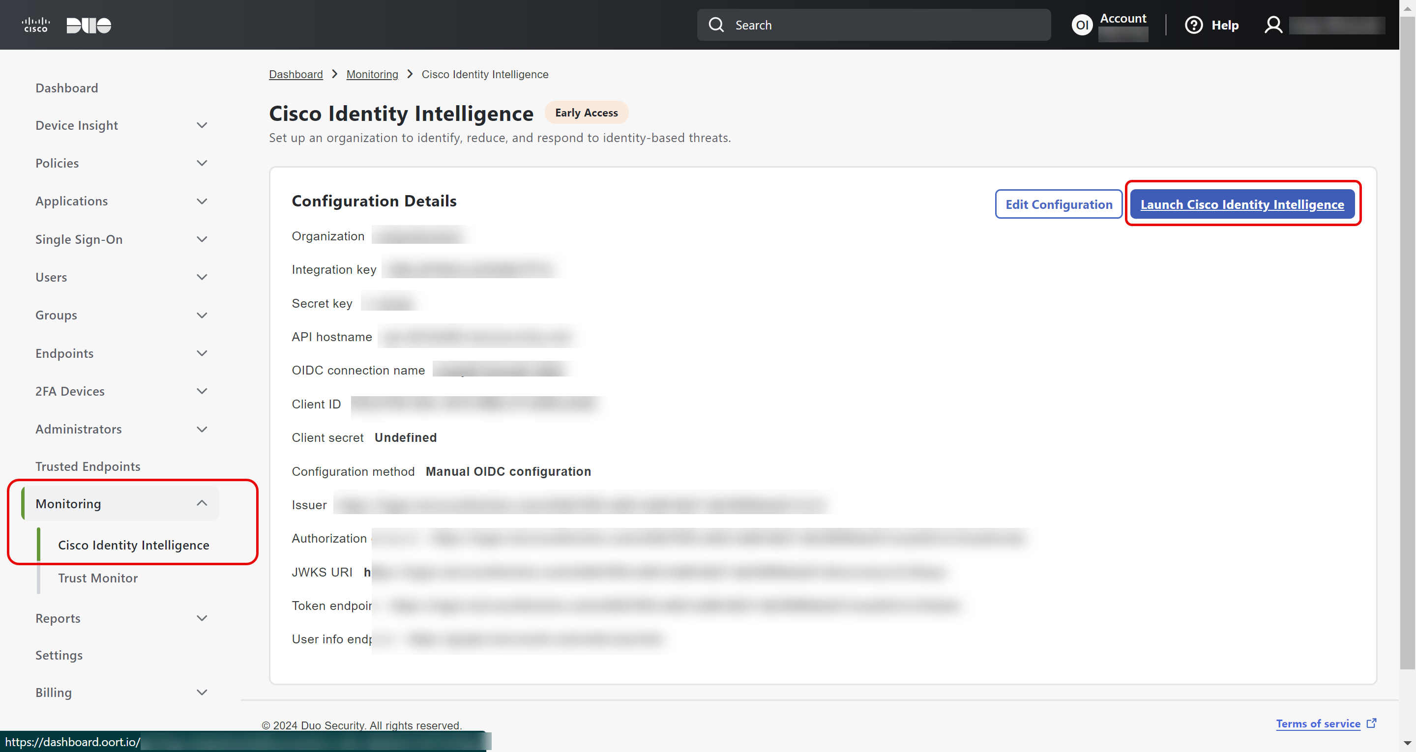 If your Cisco Identity Intelligence tenant has been [provisioned from your Duo tenant](https://duo.com/docs/identity-security#provision-your-cisco-identity-intelligence-tenant), then you can access Identity Intelligence from the <mark style="color:blue;">**Launch Identity Intelligence**</mark> button under the Monitoring tab.