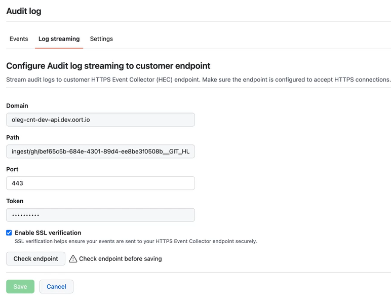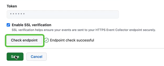 11. Back on the Github streaming configuration page, click the `Check endpoint` button.  Once successful, click `Save` <br>