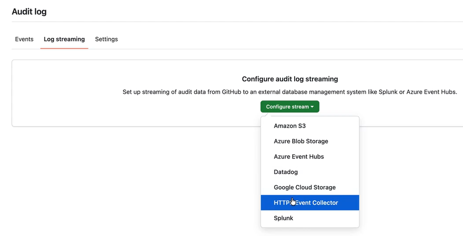 Github has the capability to [streaming the audit log events](https://docs.github.com/en/enterprise-cloud@latest/admin/monitoring-activity-in-your-enterprise/reviewing-audit-logs-for-your-enterprise/streaming-the-audit-log-for-your-enterprise). This is currently in Beta.  If you do not see the option in your Github Enterprise tenant, contact your Github representative.&#x20;