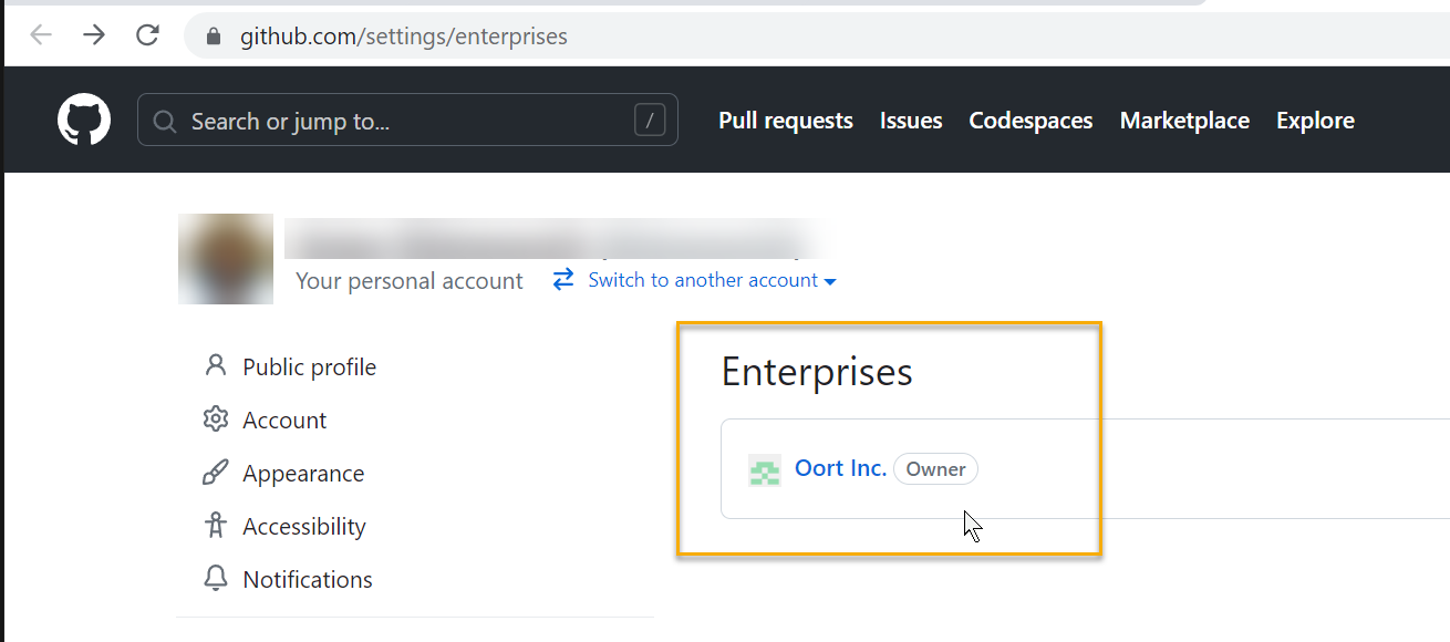 1. Login to Github with an **Enterprise admin account.**  If you navigate to [github.com/settings/enterprises](https://github.com/settings/enterprises), it should look something like the following:<br>