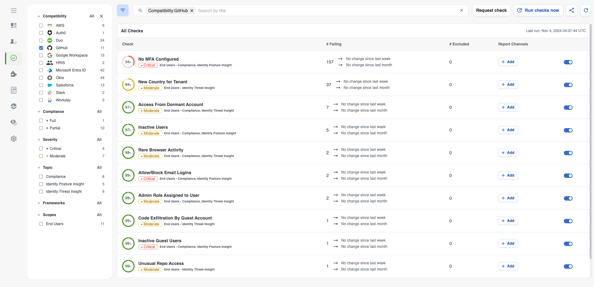 Currently, 11 security posture and threat detection Checks are compatible with the Github integration.  Identity Intelligence is continuously adding to this list, based on customer requests and also new and emerging identity-based threats for Github. &#x20;