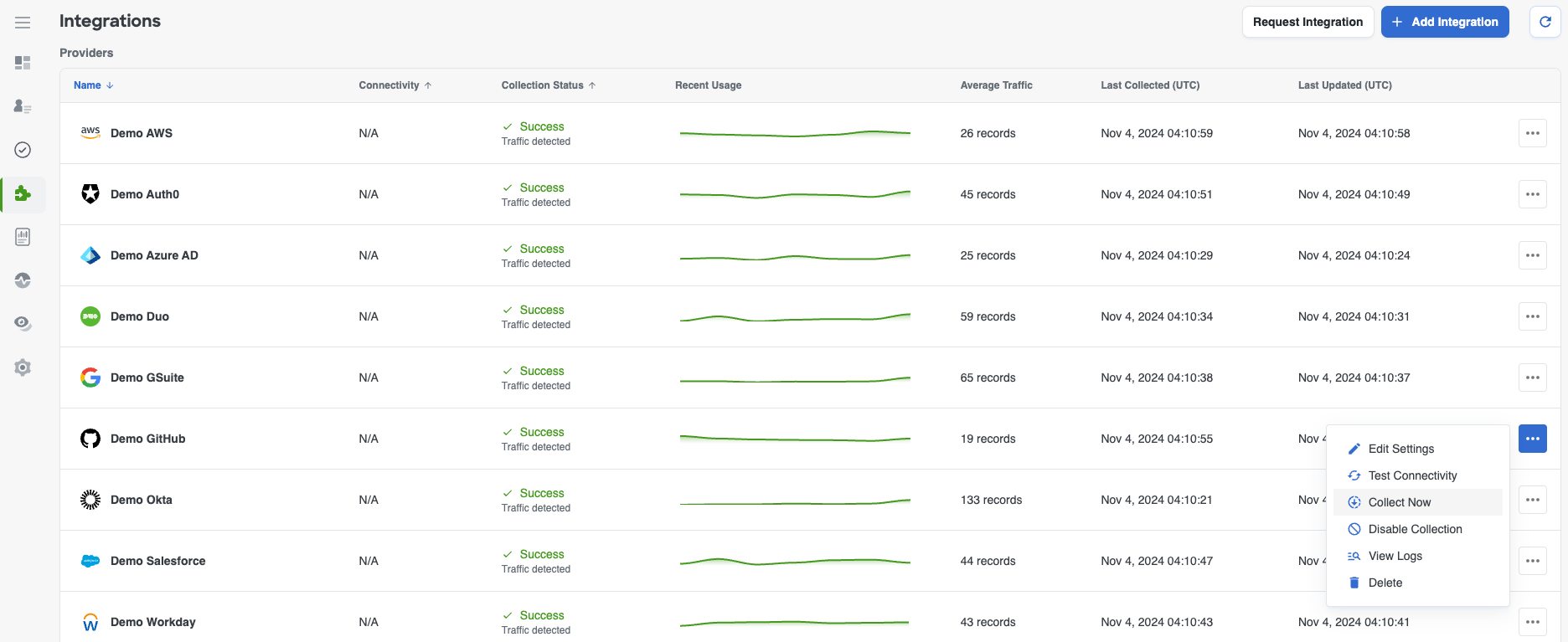 5. Once the configuration connection is successful, go back to the main **Integrations** page, click the 3-dot menu on the Github integration and select **Collect Now**. Collection may take some time, depending on the size of the environment.