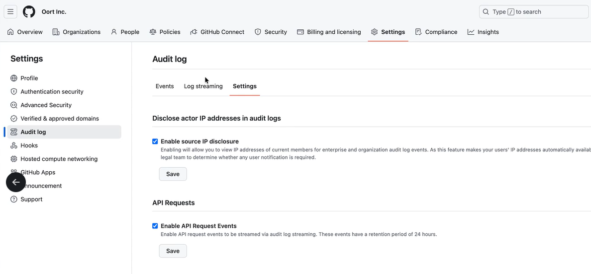 6. Within Github, navigate to Settings -> Audit Log -> Settings.  Ensure that `Enable API Request Events` is checked. <br>