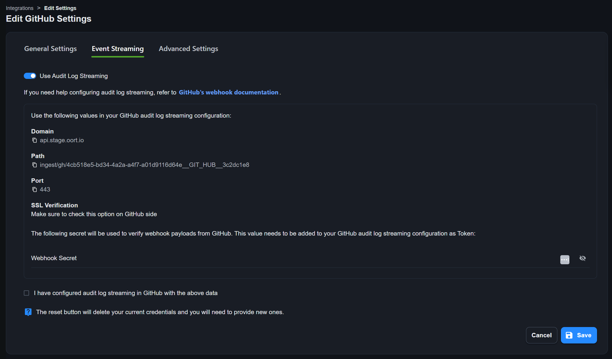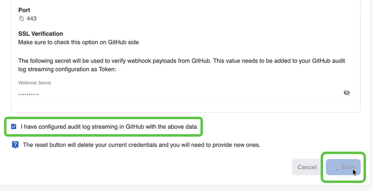 10. Back in the CII integration settings, click the checkbox to confirm that you have configured Github streaming in that platform and then click `Save`. <br>