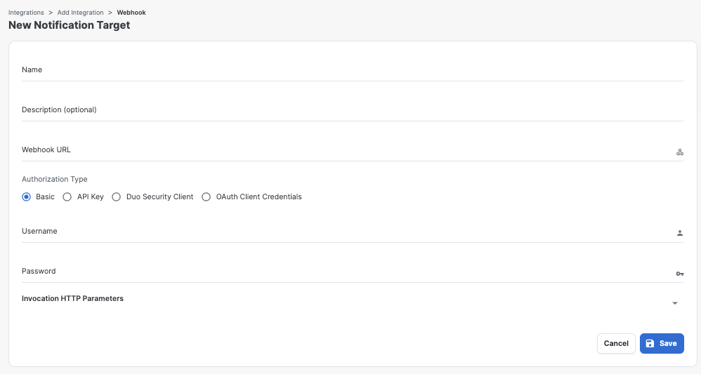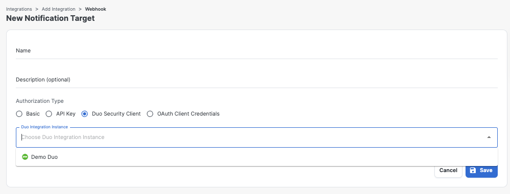 In this release, we are introducing a new Webhook Authorization type for Duo. When you go to set up a new webhook notification target you will now see ‘Duo Security Client’ as an Authorization type. Selecting ‘Duo Security Client’ will display a dropdown for you to choose which Duo instance the target will be set up as. &#x20;