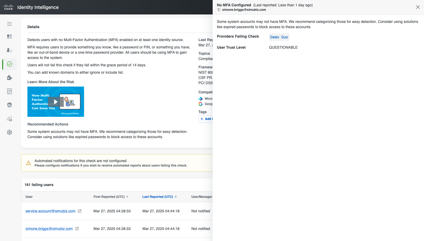 Detects users with no Multi-Factor Authentication (MFA) enabled on at least one identity source.